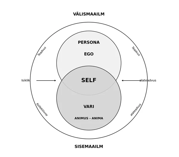 Joonis 2. Psüühe skeemProtsessi, kus teadvus ja alateadvus omavahel suhtlevad ning suhestuvad ning ego ja psüühe sügavama keskme Selfi vahel toimub dialoog, kus teadvuse ja alateadvuse vahelisest, teadlikult hoitud pingest tekivad uue kvaliteediga omadused ning lahendused, nimetab Jung individuatsiooniprotsessiks. Individuatsioon on täielikumalt iseendaks saamine, kus inimene on terviklik (dünaamilise protsessina, mitte fikseeritud seisundina) tänu sellele, et teadvuse ning alateadvuse vahel on sild ning dialoog.
